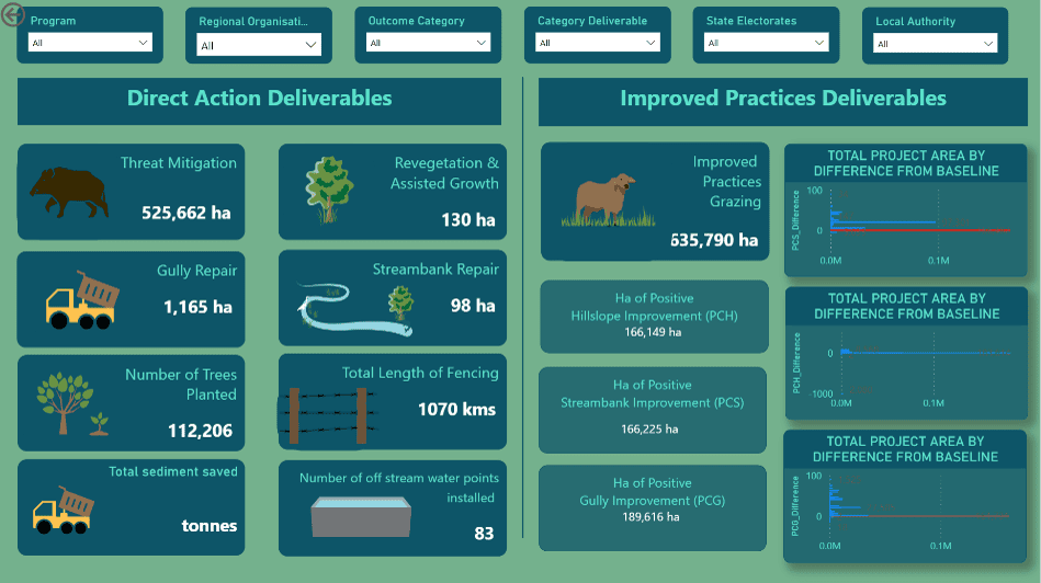 The dashboard is publicly available, with eight webpages of visuals providing differing levels of detail (see above). Users can filter by delivery organisation, individual outcomes, dates, as well as by state electorate and local government areas – a valuable function for departmental staff who need to brief politicians, usually with limited time to consult individual project delivery partners.