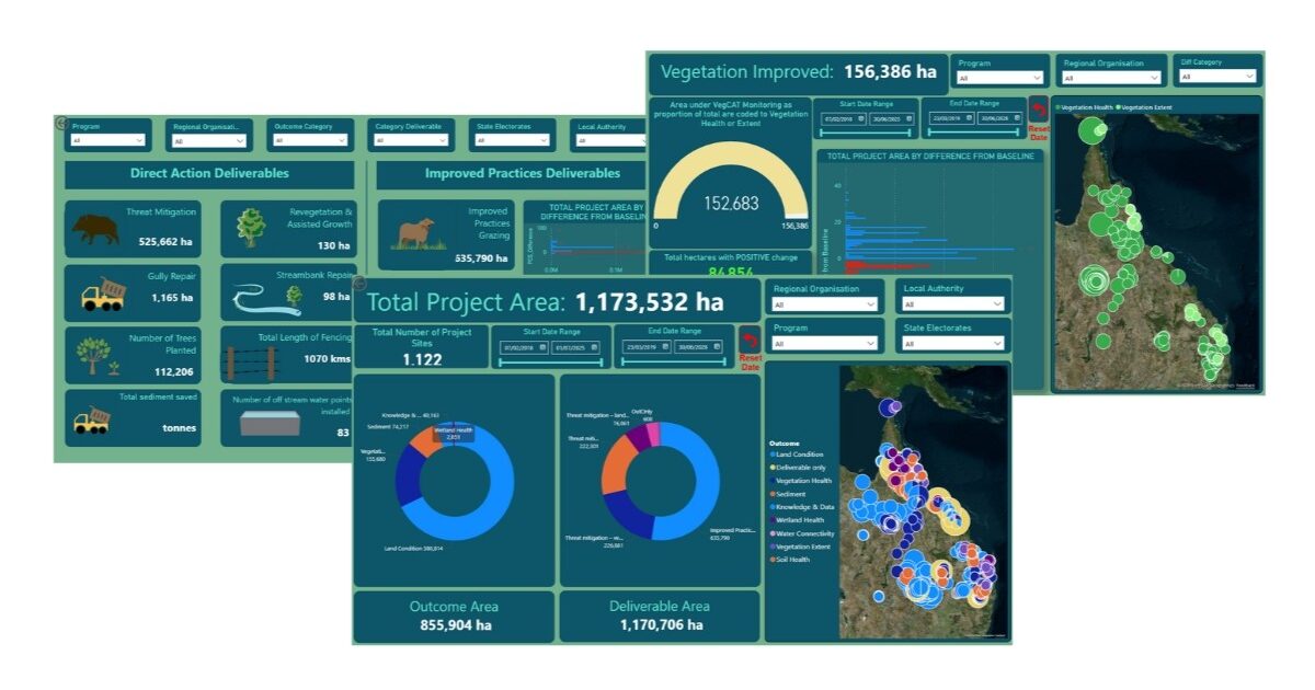 The data shows progress towards outcomes such as improved vegetation or land condition, as well as providing ‘widgets’ such as the number of trees planted, the length of fencing installed, and similar outputs. Importantly, this data can be used to review projects internally and inform adaptive management and continuous improvement.
